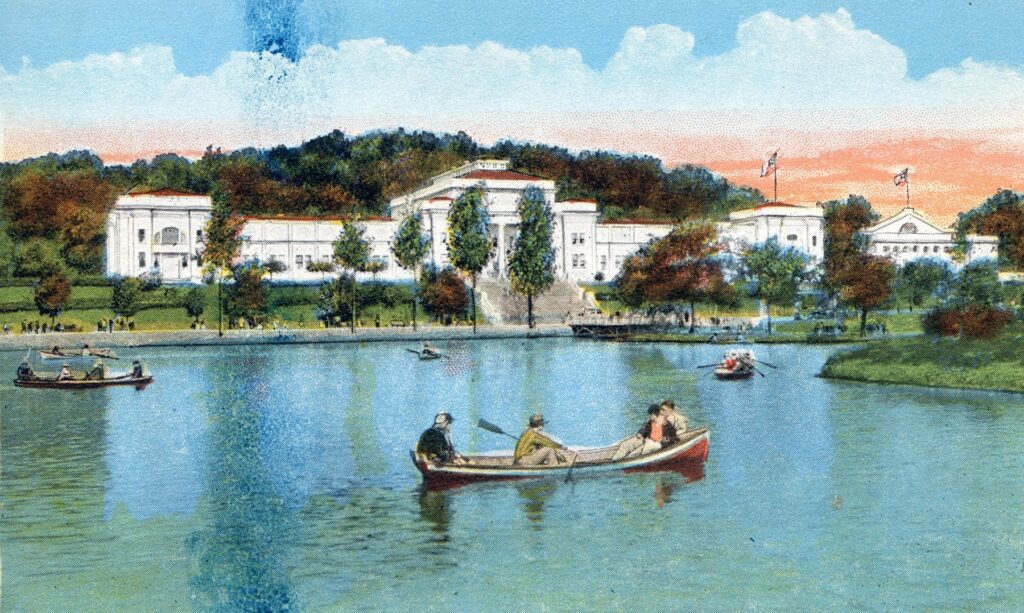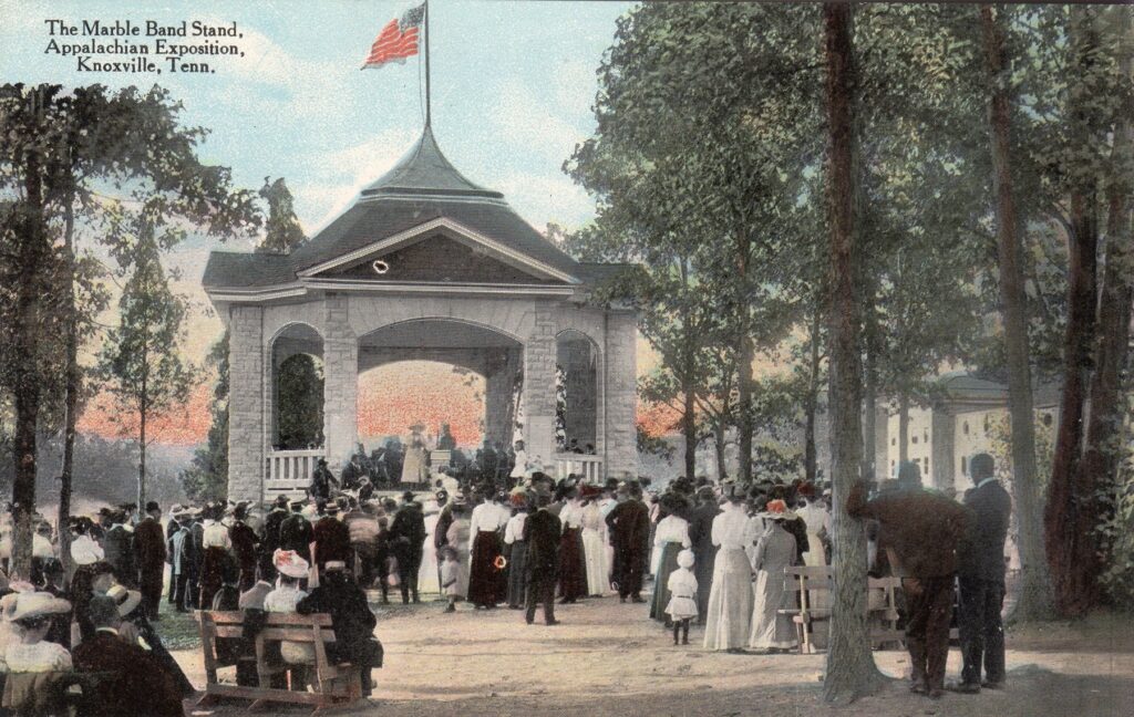 Luring Knoxville residents from downtown, where most of the soot and grime accumulated, the park became much more popular when streetcars came along in the 1890s. However, three significant cultural events changed Chilhowee Park forever. Large wooden, World’s Fair-like buildings were constructed for the Appalachian Expositions of 1910 and 1911, each with its own theme including local industry, the arts, and achievements by local Black people, while the grounds staged exotic performers and circus animals. The grander National Conservation Exposition of 1913 naturally focused on environmental themes, but it also featured acrobatic feats and daredevil motorcycle races.