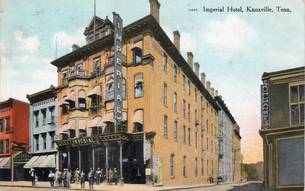 A postcard of the Imperial Hotel from the early 1900s. The angle of the photograph shows how far back the hotel extended along Clinch Avenue. It’s hard to see, but there is a small sign on the right corner of the building that reads “SHAVE,” denoting the barber shop, a service that continued from the days of the Hattie House. (Alec Riedl Knoxville Postcard Collection/KHP.)