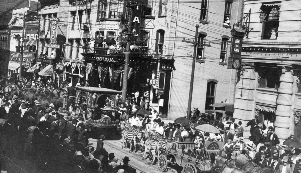 Imperial Hotel guests with rooms facing Gay Street enjoy a circus parade featuring this zebra float in 1910. When they came to town, circuses often paraded their animals right from the railway station through downtown, drumming up interest for the evening’s show along the way to the circus grounds. (McClung Historical Collection.)