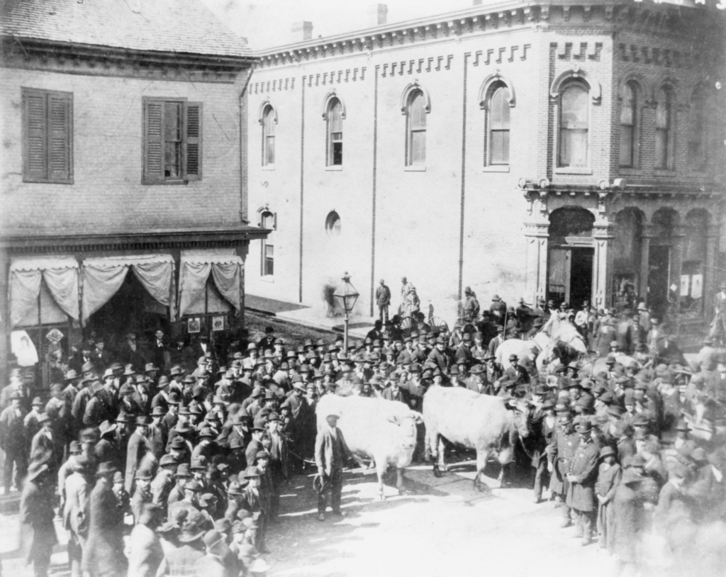 About 150 years ago, a large crowd gathered one day on the southwest corner here to pose with Col. Perez Dickinson and his “Mammoth Island Home Steers.” They would achieve photographic immortality.