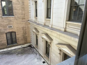 In fact, yes, we can. Head into the East Tennessee History Center, take the elevator up to the third floor, and walk through the McClung Historical Collection. Before you get to the reading room (where the Federal court convened) you can look through a window and still see most of the eastern façade, at least the top two floors of it. When the 1909 addition was designed, the architects created a “light court,” to naturally illuminate the Federal Courtroom.