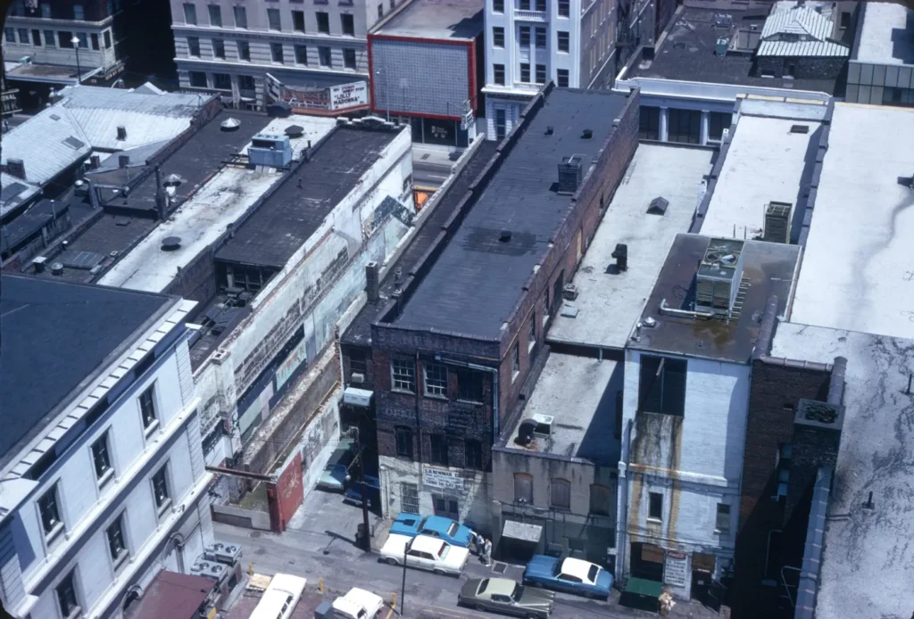An early 1970s aerial view, looking east towards the rear of the Fouche Block (top left), gives a sense of the depth of the building, and its location in relation to the Custom House. (Knox County Archives.)