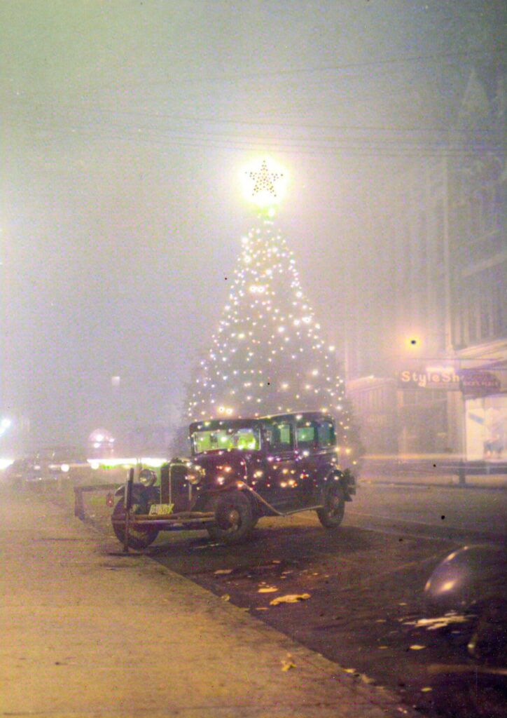 The city’s first public Christmas tree was erected by the Jovians (a trade union of sorts for electrical workers) who unveiled it on Market Street on a rather dreary and rainy Christmas Eve in 1914. In late afternoon, as the bell rang at nearby Second Presbyterian Church (then on W. Church Avenue at Walnut Street), a bright star appeared on the top of their tree, with more than a thousand electric lights—a sight never before seen in Knoxville.