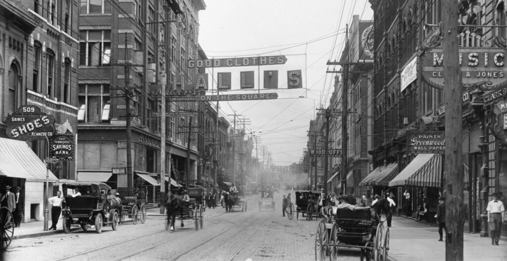 Life on Gay Street at Union Avenue with multiple forms of transport, circa 1906. (McClung Historical Collection.)