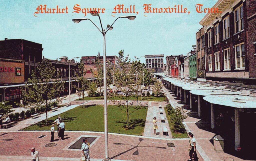 After the iconic Market House was torn down in 1960s, the city re-envisioned Market Square as a park-like space with concrete storefront awnings, colloquially referred to as “toadstools.” (Sam Furrow Knoxville Postcard Collection/KHP.)