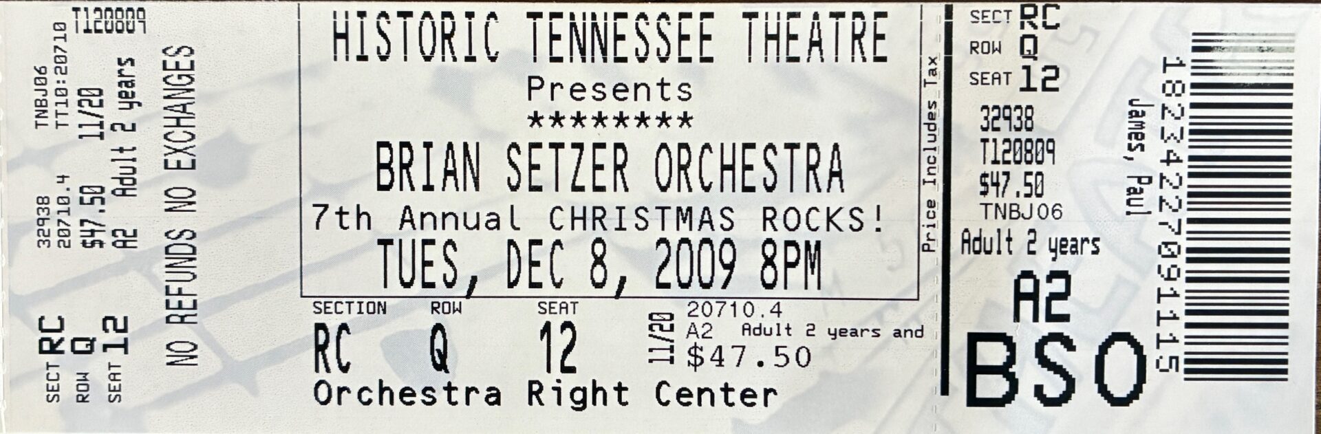 2009: Gig ticket for Brian Setzer Orchestra, Dec. 2009. Much of the show can be heard on the the rockin' CD, Christmas Comes Alive by BSO. (Courtesy of Paul James.)