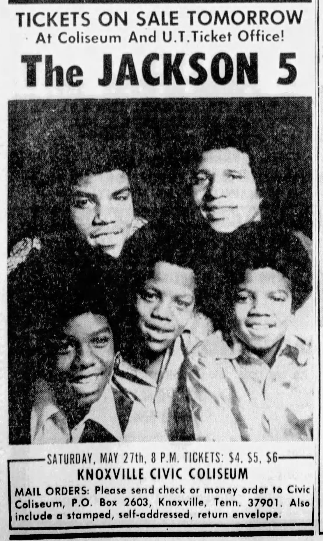 1972: The Jackson 5 first played in Knoxville at the Civic Coliseum and came back in 1984 for the "Jackson Victory Tour"--three nights at Neyland Stadium, the first large scale concert ever at that venue.
