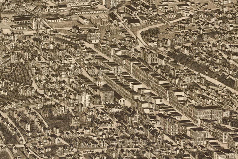 Featured Photo: Knoxville in 1886, from a bird’s-eye perspective, shows Depot Street and the rail yards at top, and Gay Street at an angle at upper right. The building marked “E” is Tennessee’s first durable public library, the original Lawson McGhee, now known as the Rebori Building. Market Square, which then featured a long, low market house, is visible at center right.